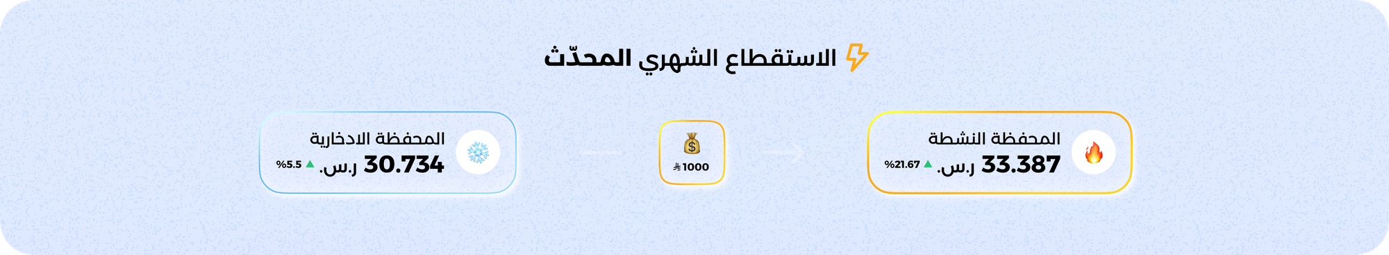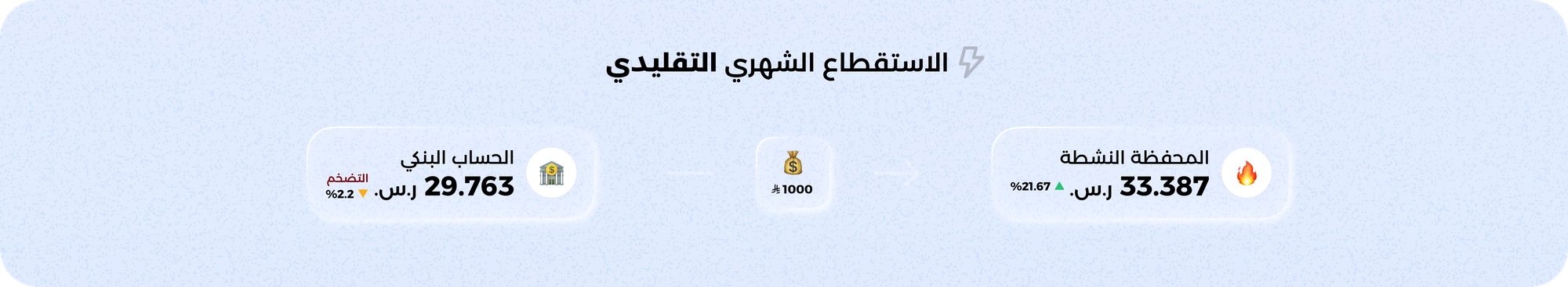 في الطريقة المحدّثة، الاستثمار بدال ما يستقطع من حسابك الجاري اللي ينقص 2.2٪ سنويًا بسبب التضخم. يستثمر في المحفظة الادخارية بعائدها 5.5٪ ويستقطع شهريًا من المحفظة الادخارية للمحفظة اللي تختارها. فتضمن أنك مطبق الاستقطاع الشهري، وتضمن أن المبلغ اللي محدده للاستقطاع قاعد يزيد من قبل لا يبدأ يُستثمر.